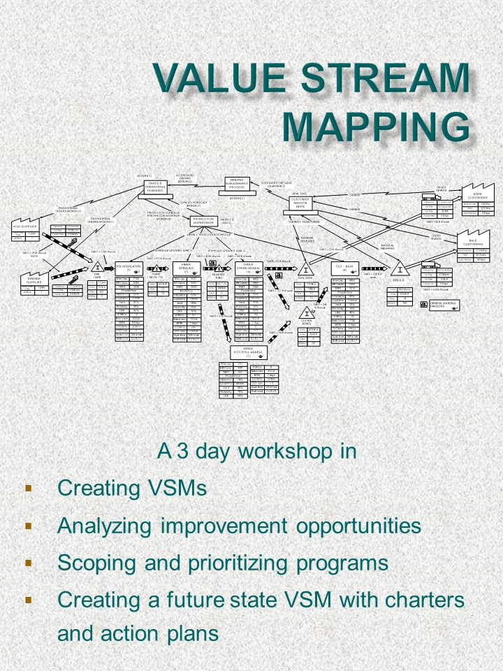 Value Stream Mapping (VSM) is a seemingly simple yet very powerful way to see your process as an integrated, interconnected system. A VSM gives you a unique perspective on your process, how material flows, how the process performs and why it doesn’t do so perfectly. It provides a straightforward, easy to understand, picture of all your major production equipment, the material that flows through it, and the factors influencing flow at each step. It also charts all of the communication processes and information transformations that ultimately control material flow.